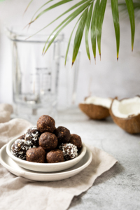 Puhasta datlid kividest ja leota kuumas vees 5–10 minutit (Medjool datleid leotama ei pea). Mõõda nõrutatud datlid, kakao, kaera- ja kookoshelbed Blendteci Twister kannu ning blenderda u 15 sekundit, keerates samal ajal kaabitsatega kaant. Lisa 4–5 sl leotusvett (või külma vett) ja surista veel paar sekundit. Vormi pallid ja veereta soovi korral kookoshelvestes.